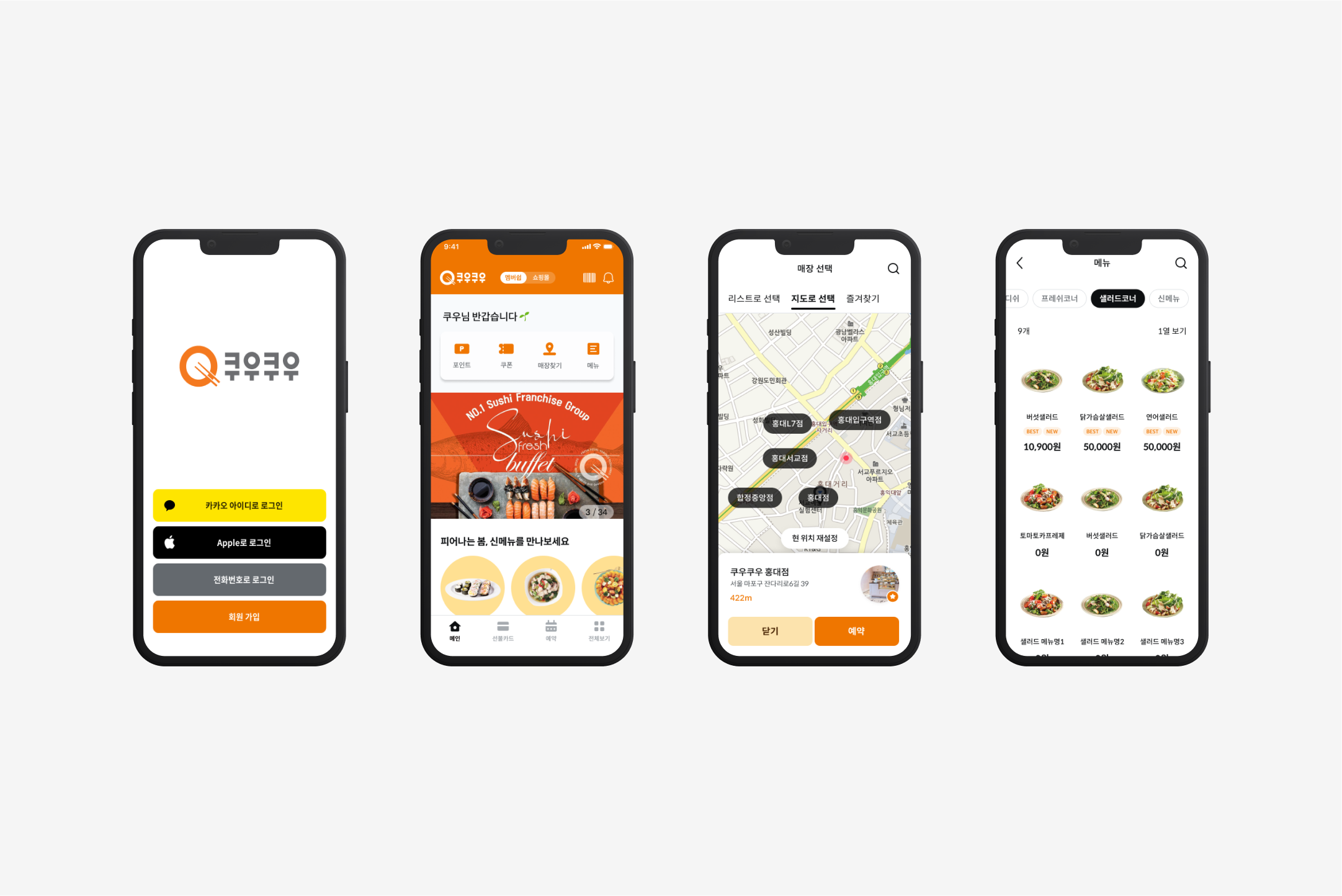 초밥과 스시 뷔페 브랜드 쿠우쿠우의 앱 제작을 위한 제안서부터 실제 앱 디자인까지 작업을 맡았습니다. 기존에 자사 탬플릿에서 제작된 사례가 없던 종류의 페이지들, 새로운 기능들이 있어 고객사와 자사 기획팀, 중간 협력 기획사 ‘아트그라피’ 등 여러 담당자와 장시간 협업했습니다.