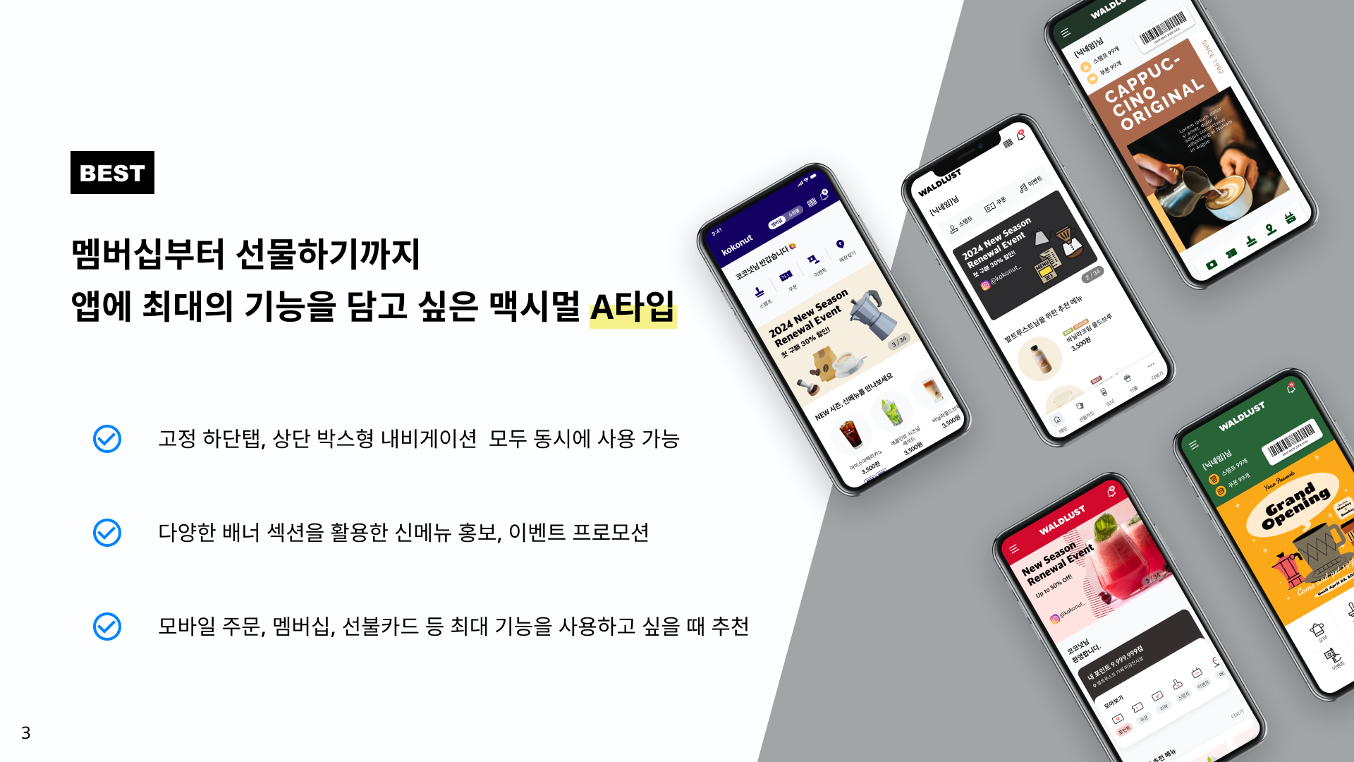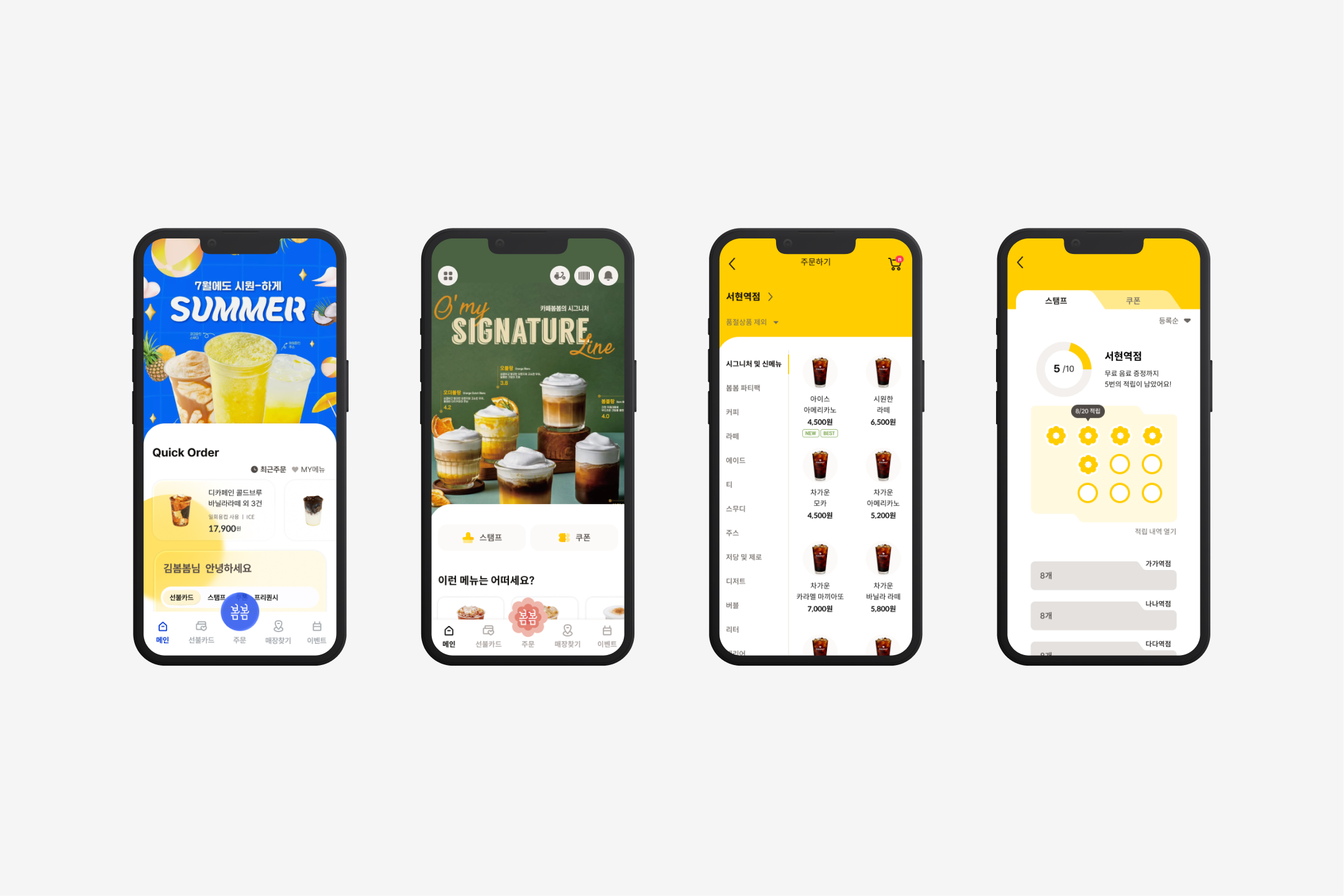 앱들은 커스텀 범위의 경중에 따라 순서대로 라이트형(메인/멤버십만), 스탠다드형(메인/멤버십/오더 페이지까지), 스페셜형(전체)으로 분류해서 관리했으며 저는 주로 디자인 난이도가 높은 스탠다드형과 스페셜형을 작업했습니다. 하단에는 대표작만을 요약해 담았습니다.